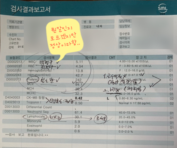아무리 생각해도 멍 13개는 많이 생긴 거 같고 찝찝해서 이번에는 전화하지 않고 백신 접종받은 내과에 그냥 갔다. 접수할 때 간호사분께 증상을 말하니까 처음에는 큰 병원 가라고 했다가 피검사해달라고 요청해서 의사 진료받을 수 있었다. 멍 생긴 위치를 보시더니 이상하다고 피검사 진행하자 하셔서 피 뽑고 왔다. 금액은 13800원 나왔고, 결과는 하루 뒤에 나온다 해서 다음날 결과 들으러 병원에 갔다 왔다.