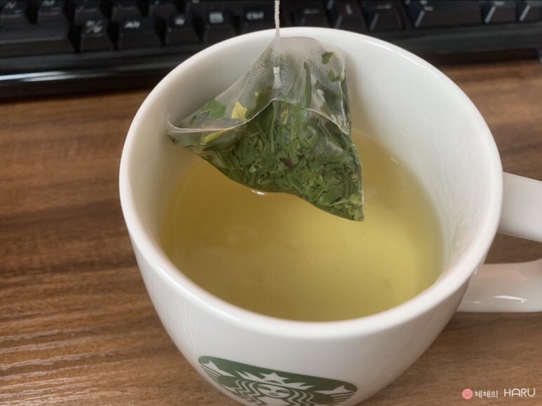 티백 안 녹차가 풀잎같이 생긴것들 변하고 꽉 찼다