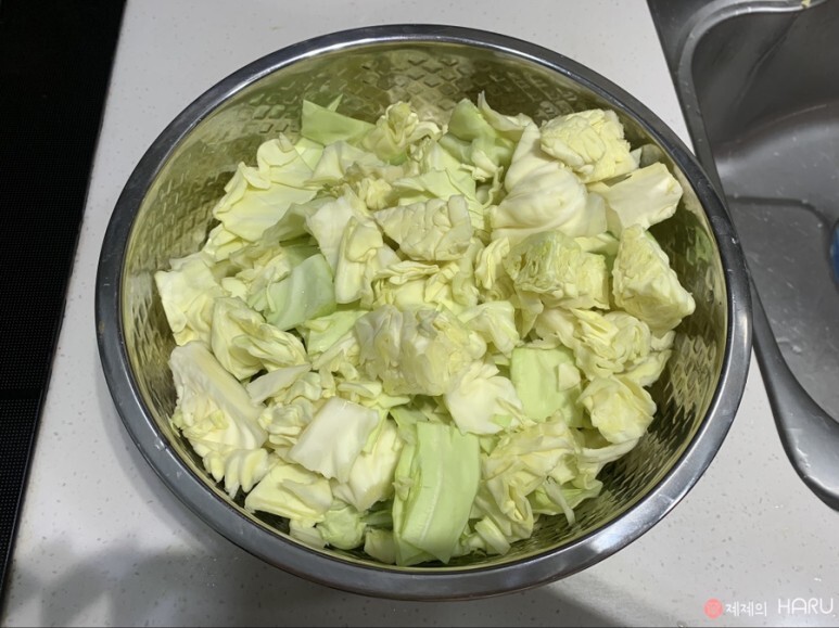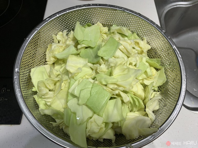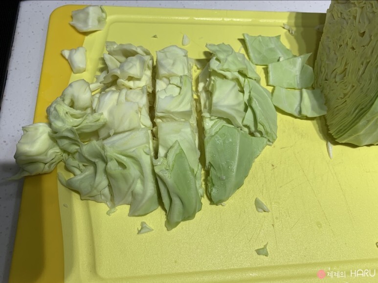 양배추를 먹기 좋은 크기로 썰어줍니다