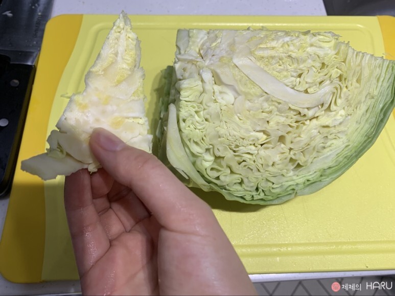 양배추 겉면을 1~2장 벗겨주고 심지를 썰어주세요