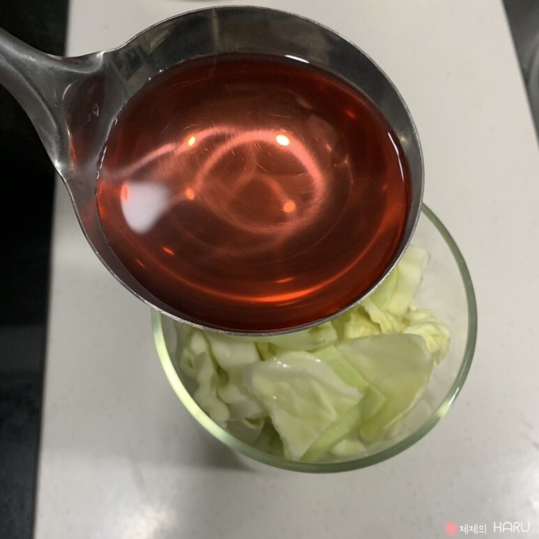 양배추가 둥둥 뜨는걸 방지하기 위해 가득 채워줬어요