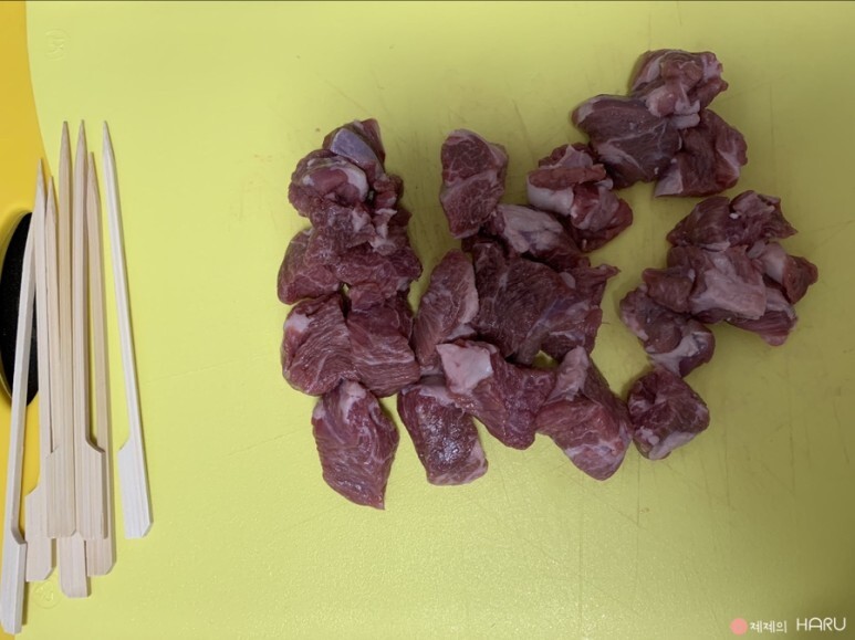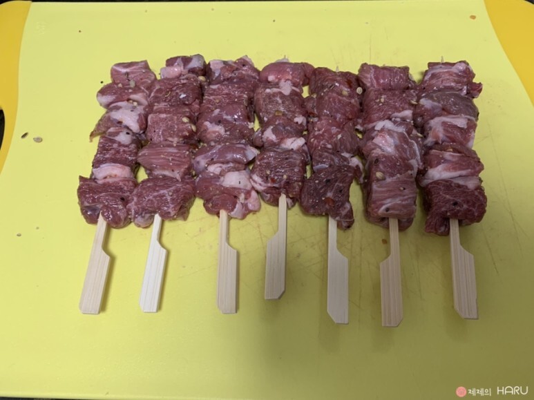 꼬치에 양고기를 꽂아주세요