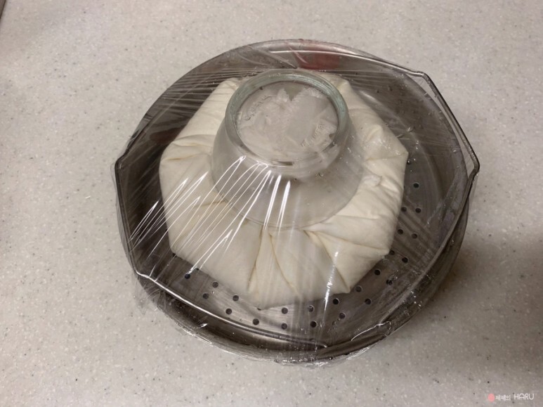 면포에 요거트를 붓고 감싼 뒤 무거운 걸로 눌러줍니다