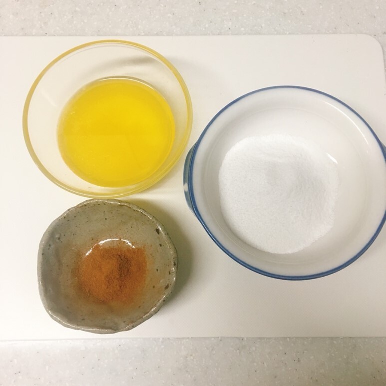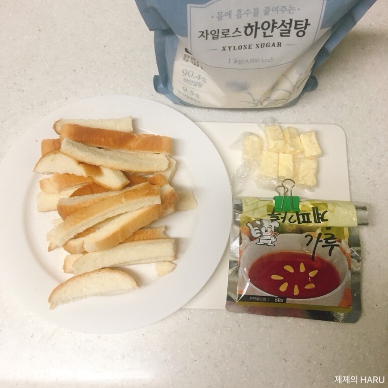 식빵테두리, 설탕 아빠숟가락 4, 버터 8조각, 시나몬가루 티스푼 1