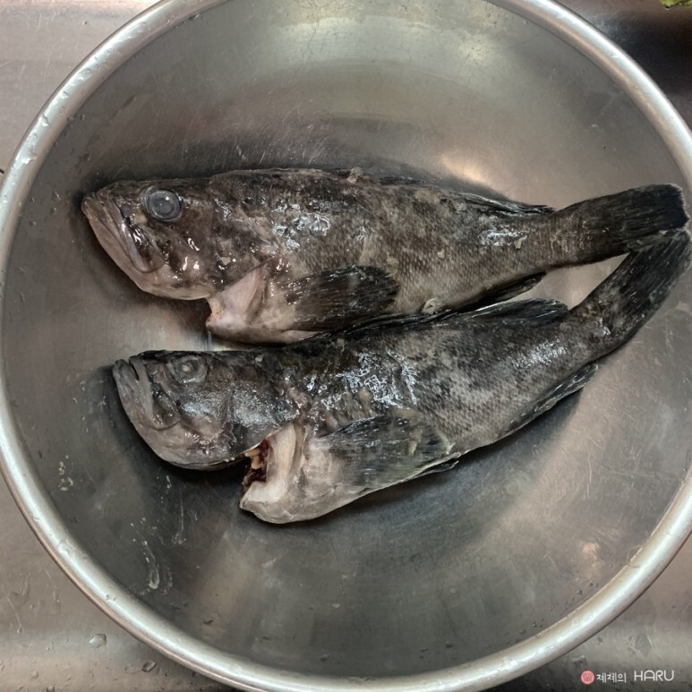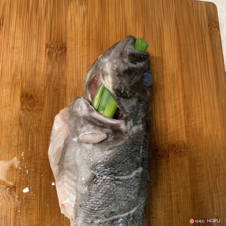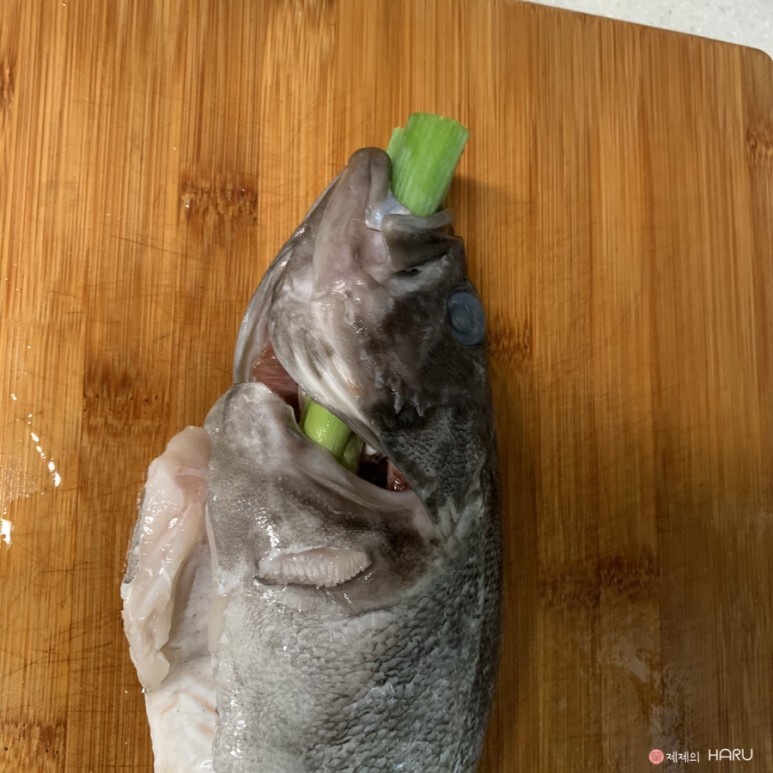 비린내 제거를 위해 길쭉한 파를 우럭 입 속에 통과시키고