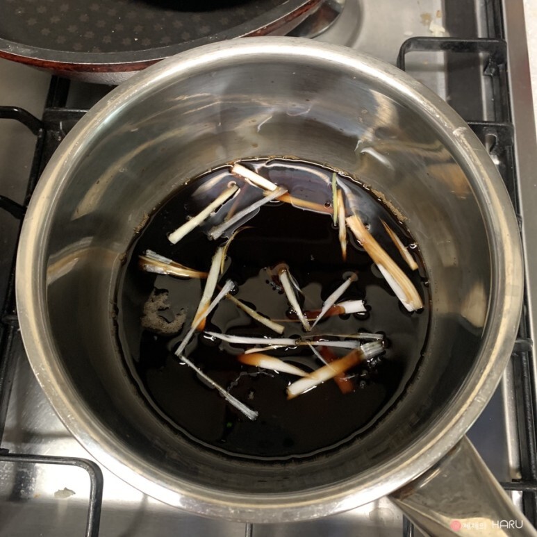 우럭을 찌는 동안 간장에 설탕, 대파를 넣고